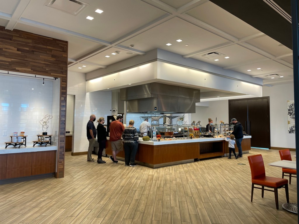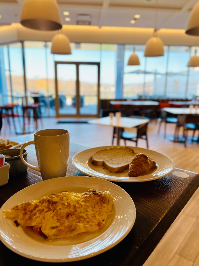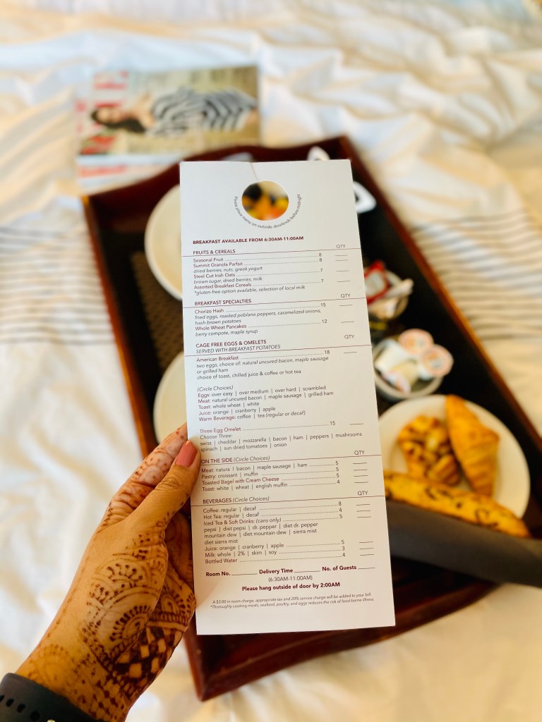 The Summit Hotel offers breakfast at “The Market” which is an extension to the Overlook Kitchen + Bar restaurant. They usually have a self serve breakfast buffet but due to Covid-19, the hotel staff was serving breakfast instead of self serve. The interiors of the breakfast place were gorgeous and the little details that were incorporated into seasonal décor, made it so welcoming. Breakfast consisted of bread and other bakery items like Danish, croissant, pastries, etc., a live omelet station where you can customize your omelets, other breakfast items like sausages, biscuits and gravy, fresh berries and seasonal fruits. We enjoyed the delicious breakfast at “The Market” the first day and the next day we ordered breakfast in our room because no staycation is complete without breakfast in bed right?
